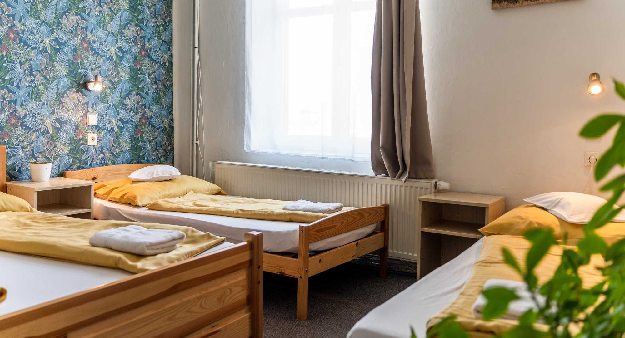 Barevně zařízený šestilůžkový pokoj s kobercem. Manželská postel, 2 samostatné postele a 1 patrová postel v oddělené místnosti.