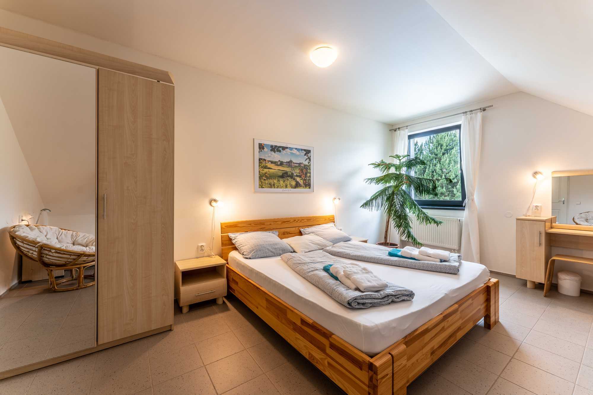 - Dispozice 3 ložnic: 1 x dvoulůžková; 1 x třílůžková; 1 x čtyřlůžková. (Vždy manželská postel + samostatné lůžko.) Ložnice jsou prostorné, je tedy zde možnost přesunout postele a vytvořit 2 x čtyřlůžkovou ložnici..